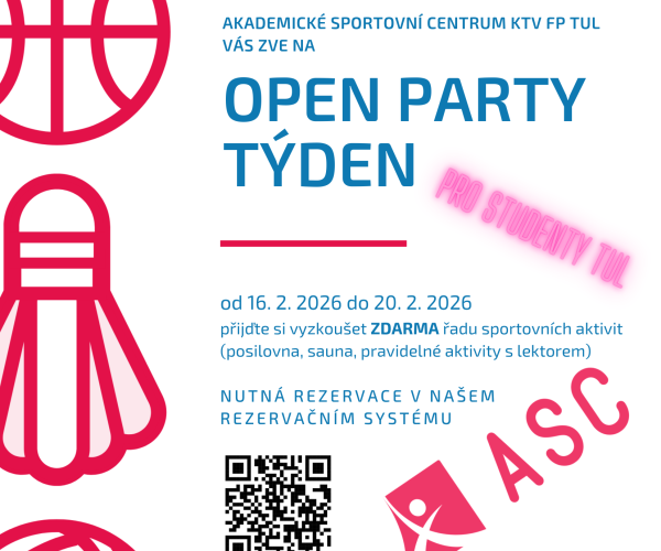 Minulý týden začal letní semestr AR 25/26 a tak Vám již tradičně přinášíme ve druhém týdnu Open party týden - týden plný sportovních aktivit pro studenty TUL ZDARMA. Lepší možnost vyzkoušet si sportování u nás není :) Těšíme se na Vás. Tým ASC