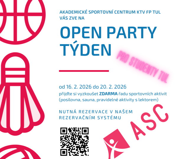 Minulý týden začal letní semestr AR 25/26 a tak Vám již tradičně přinášíme ve druhém týdnu Open party týden - týden plný sportovních aktivit pro studenty TUL ZDARMA. Lepší možnost vyzkoušet si sportování u nás není :) Těšíme se na Vás. Tým ASC