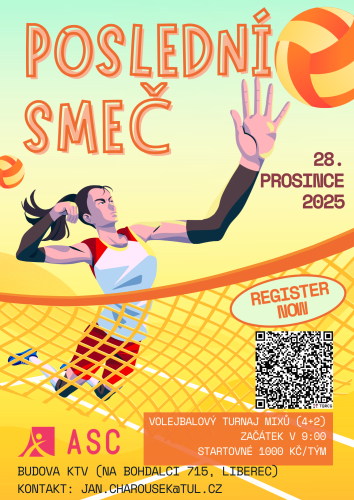 Volejbalový turnaj mixů (4+2) Poslední smeč se uskuteční 28. 12. 2025 v budově KTV (Na Bohdalci 715, Liberec). Začátek turnaje v 9:00. Startovné za tým 1000 Kč. První týmy obdrží věcné ceny. Systém turnaje bude určen dle počtu přihlášených týmů. Přijďte s námi zakončit letošní rok volejbalem. Parkování pod sportovní halou. Občerstvení zajištěno.